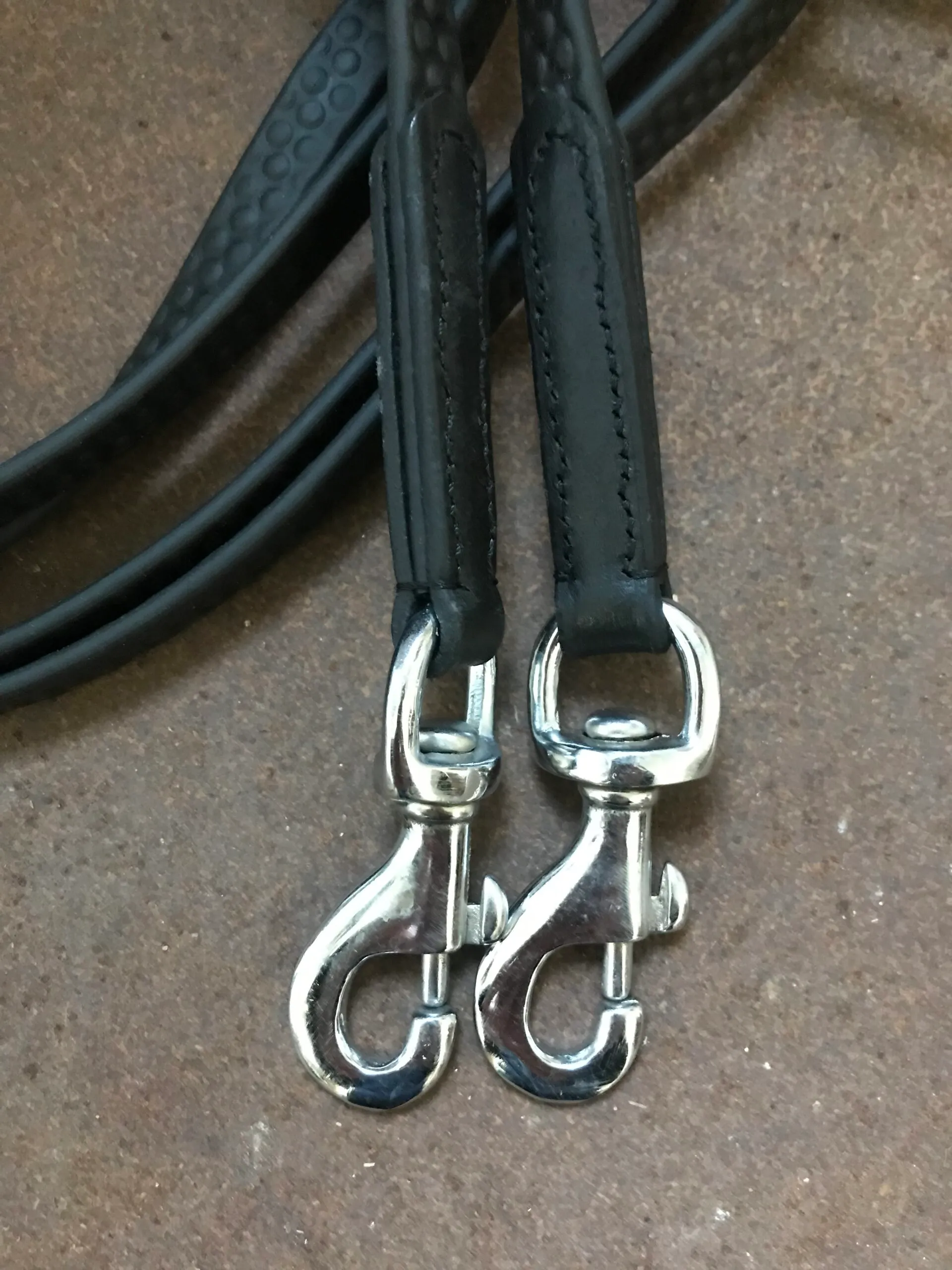 De zwarte Hestagallery Biothane teugels met nopjes en zilveren musketon zijn de perfecte combinatie van duurzaamheid, grip en stijl.