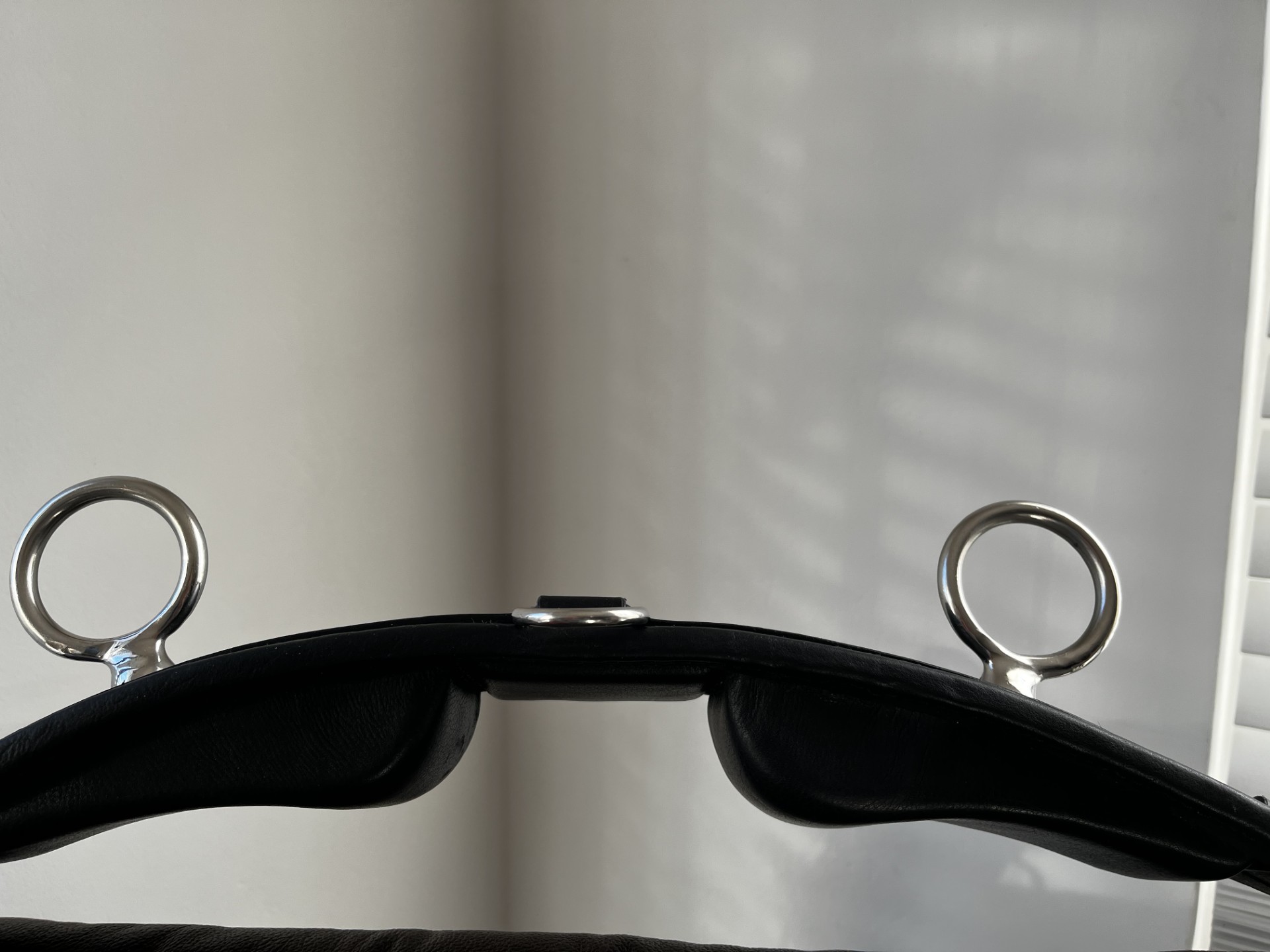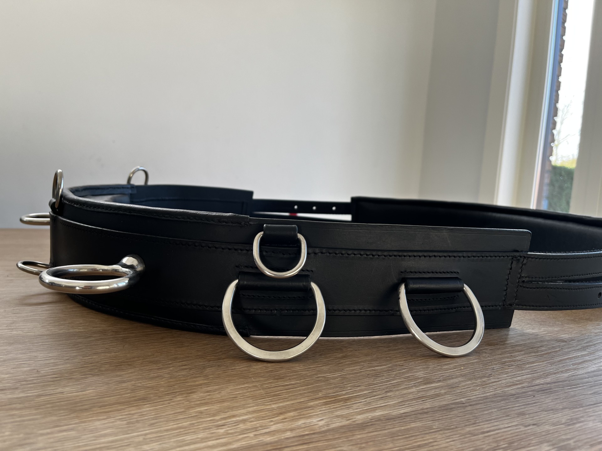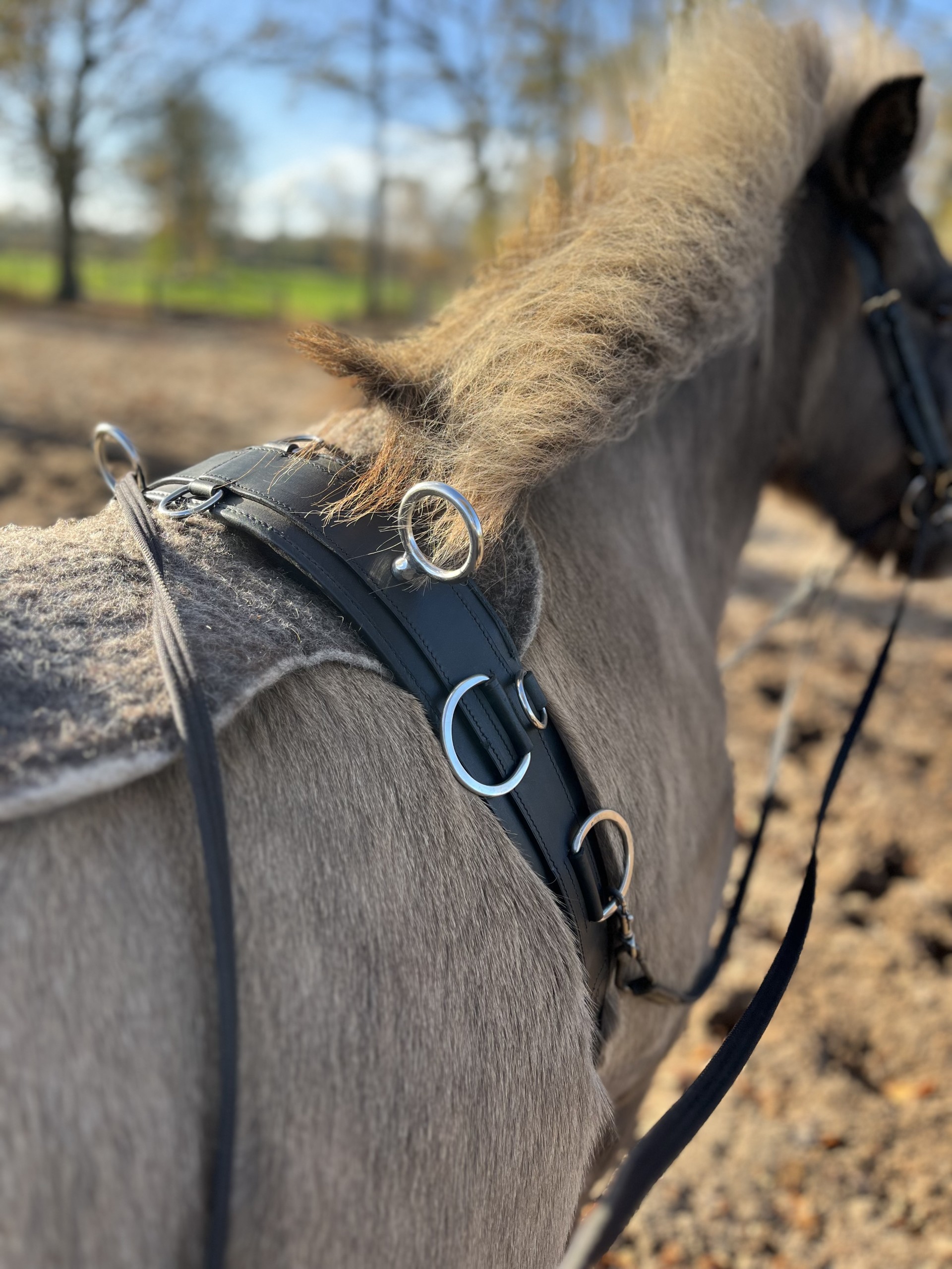 Strategisch geplaatste metalen ringen zijn zorgvuldig verdeeld voor optimale bevestiging van longeerhulpen en teugels.