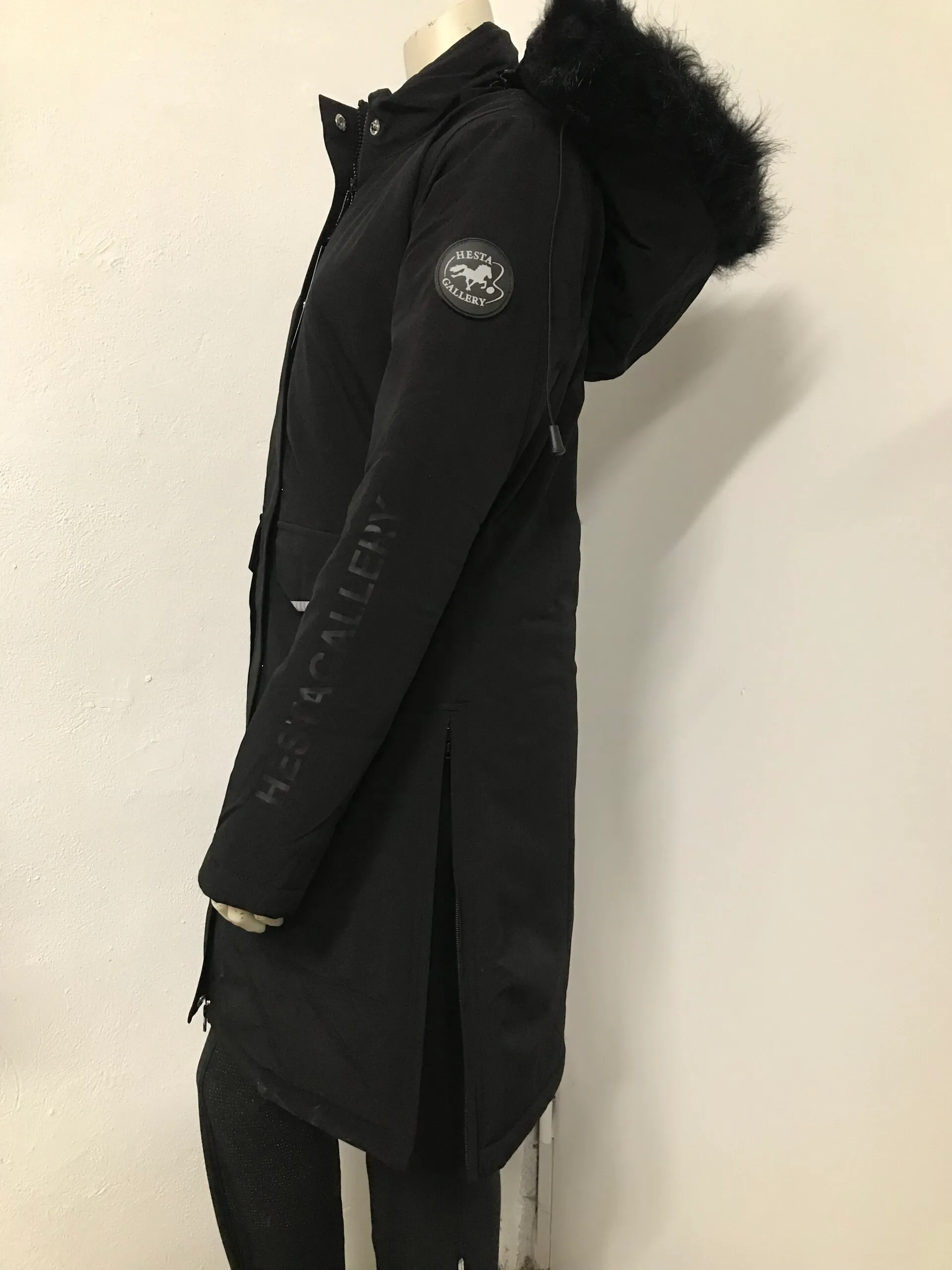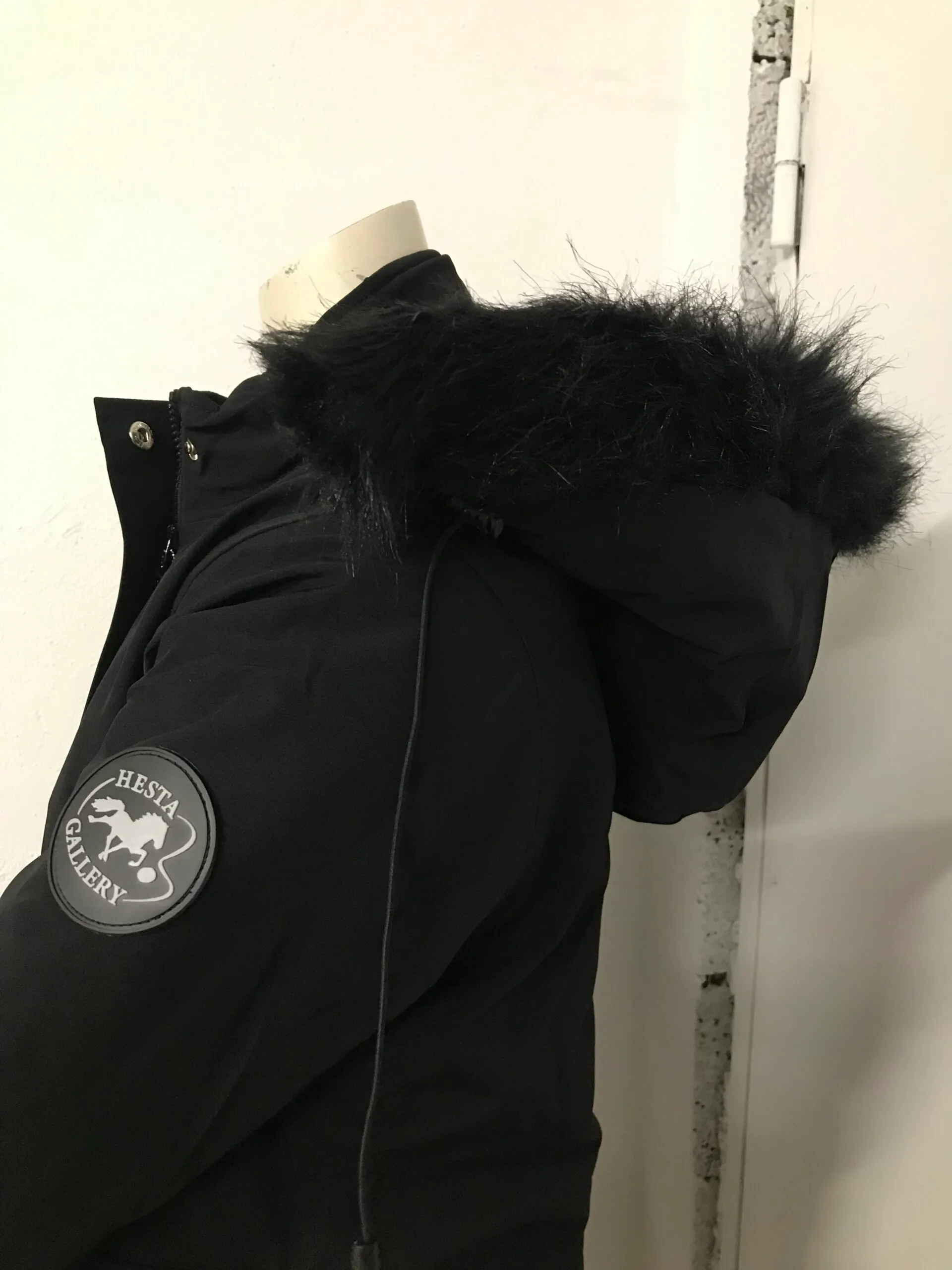 De parka heeft boorden aan de binnenkant van de mouwen en een verstelbare en afneembare capuchon met nepbontrand.